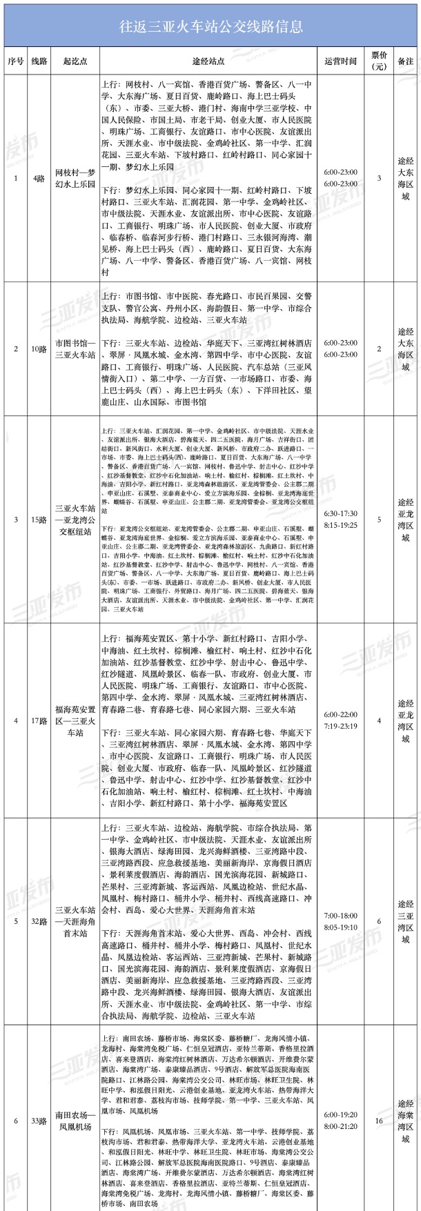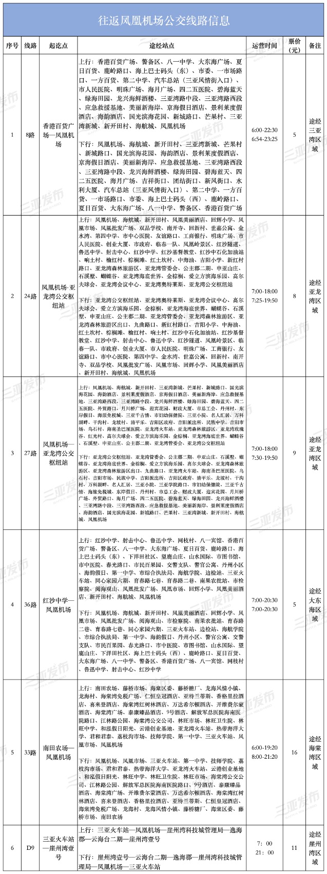 三是选择乘坐公交车前往三亚火车站、凤凰机场。往返三亚火车站的公交线路:4路、10路、15路、17路、32路、33路、35路、36路、42路、49路、50路、54路、55路、D9路等;往返凤凰机场的线路:8路、24路、27路、33路、36路、D9路等,并新开通三亚君澜度假酒店至凤凰机场专线,沿途仅停靠酒店,公交线路站点明细表详见附件。也可通过三亚公交集团公众号、微信乘车码、“车来了小程序”、高德地图等方式了解具体站点及运营时间,或拨打咨询电话0898-88985008了解详情。